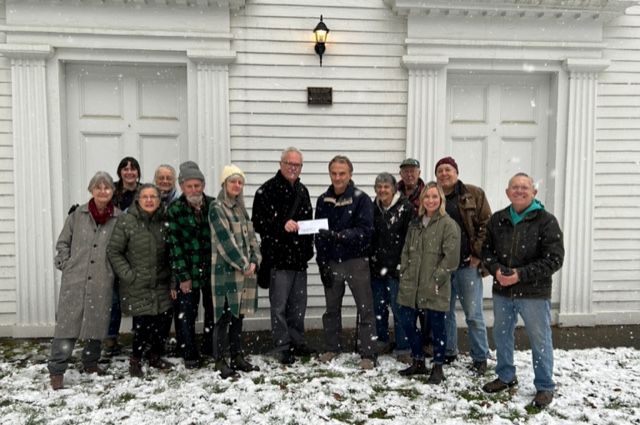 Guilford Historical Society is seen here accepting the check from Zon Estes, Chair person of the Guilford Select Board, to help us restore our beautiful historic meeting house.